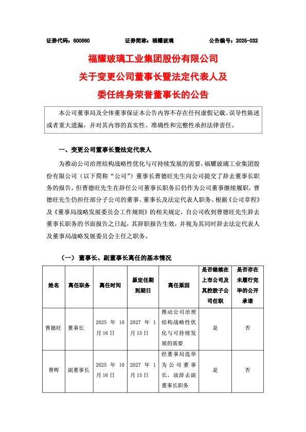10月16日,福耀玻璃工业集团股份有限公司(简称“福耀玻璃”)发布公告示意,公司董事长曹德旺因鼓励公司科罚结构政策性优化与可抓续发展的需要,辞去董事长职务,将持续担任公司董事及部分子公司的董事、董事长和法定代表东说念主职务。 福耀玻璃公告 图源:上交所 同期,福耀玻璃选举曹晖为新任董事长,并任命其为法定代表东说念主及董事局政策发展委员会主任。 曹晖 良友图 福耀玻璃示意,离任后,曹德旺被委任为福耀玻璃终生荣誉董事长。今后他将以终生荣誉董事长、第十一届董事局董事、董事局政策发展委员会委员及董事局